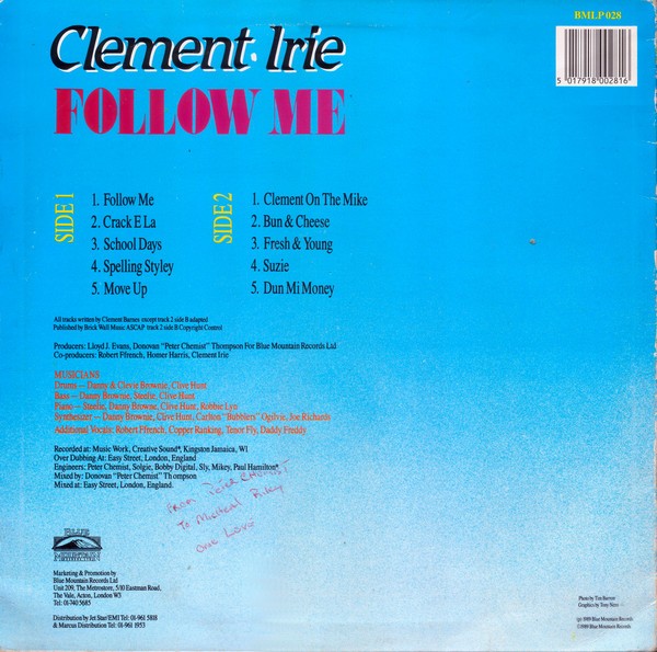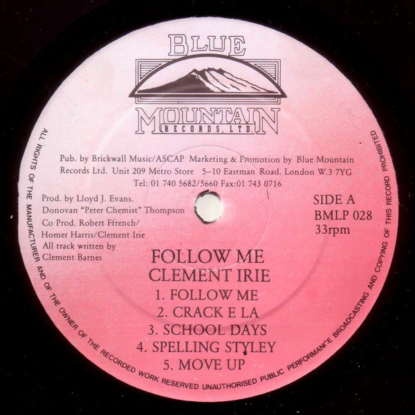 LP / 33T : Follow Me : Clement Irie : Blue Mountain Records : : Dancehall / Nu-roots : 2007210 : Neuf : 19.00€ : 0.30kg
