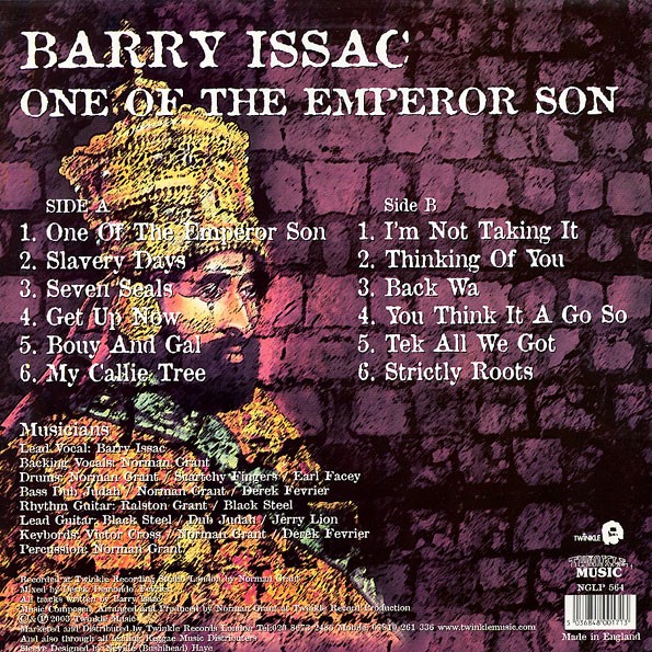 BACKING VOCALS: Norman GrantBASS: Dub Judah, Norman Grant, Derek FevrierDRUMS: Norman Grant, Scratchy Fingers, Earl FaceyLEAD GUITAR: Black Steel, Dub Judah, Jerry LionRHYTHM GUITAR: Ralston Grant, Black SteelKEYBOARDS: Victor Cross, Norman Grant, Derek FevrierPERCUSSION: Norman GrantProduction for Barry Issac - One Of The Emperor SonRECORDED AT: TwinkleMIXED BY: Demondo